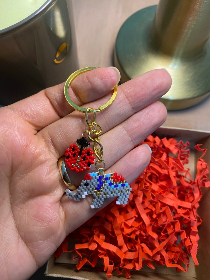El yapımı orijinal Miyuki boncuklarla yapılmış fil ve uğur böceği figürlü anahtarlık (Ürünler sizlere özel kutularda gönderilmektedir)