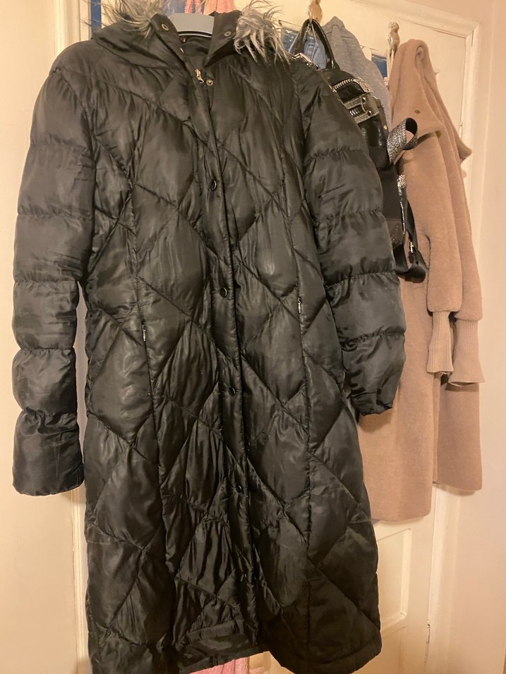 Fitted kesim, midi boy kadın kışlık mont, kürk detaylı yakaya ve notched lapel yaka sahip. Sentetik kumaştan, kapitone desende, koyu renk goth tarzında. 38 bedene uyumlu