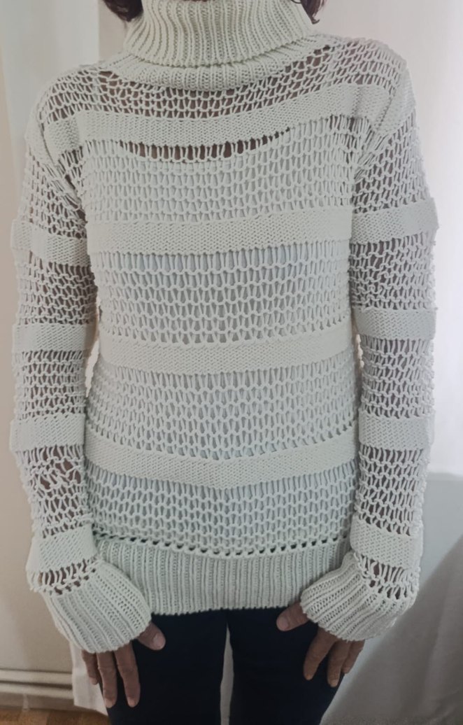 Uzun kollu, balıkçı yakalı ve ince örgüden yapılmış, gri tonlarında, modern görünümlü kadın kazak. MNG marka orijinaldir. EUR L bedendir. Ölçümleri boy: 60 cm en: 44 cm kol: 61 cmdir.