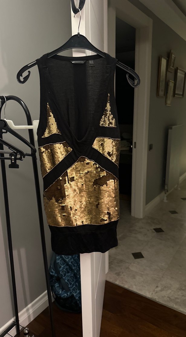 , V yakalı, kolsuz ve desenli altın-siyah bluz gotik tarzda parti için uygundur. ✨# pullarında eksik yok# özellikle yazıyorum resimlerde var gibi ama ışık yansıması. Hasarsız. Eksik olsa satmam. Kolsuz. Arkadı penye