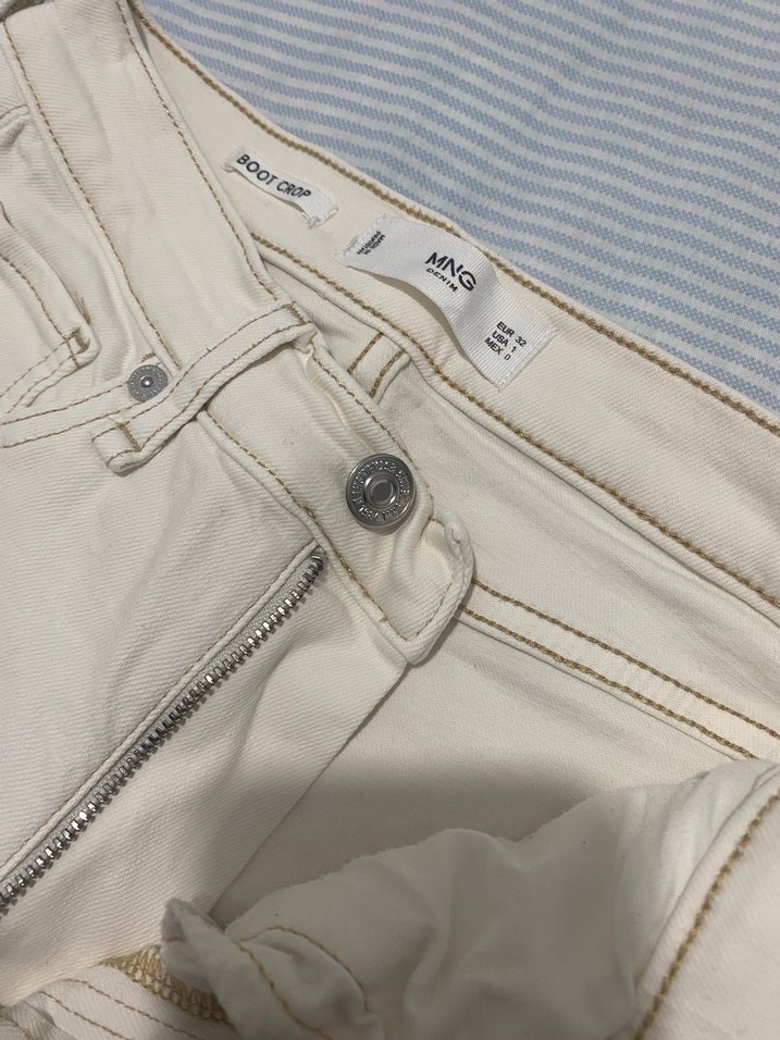 MNG markalı, fermuarlı detaylı beyaz denim pantolon, dar kesim ve günlük sokak stili için uygundur.