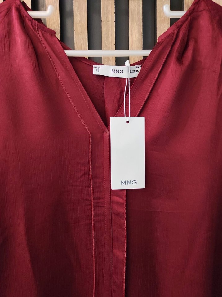 MNG markalı, parlak bordo renkte, pileli detaylı, V yakalı, saten kumaştan, salaş kesim, kolsuz midi boy kadın bluz. Etiket fiyatı 1600 TL
