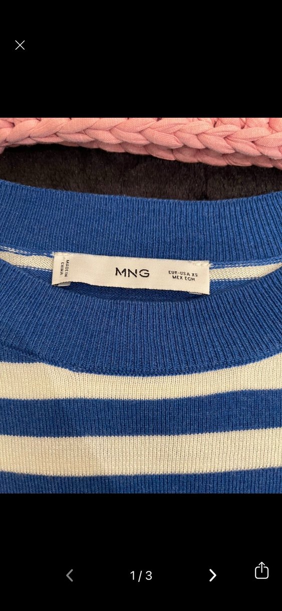 MNG markalı, çizgili desende, mavi renkli, tekne yaka ve dar kesim triko kazak.