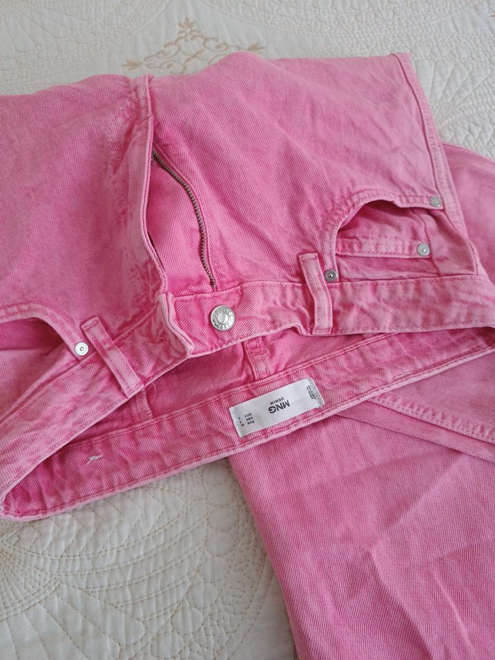 Düğmeli, midi boy, bol kesim pembe kadın denim pantolon. Günlük sokak stili için uygun, rahat ve şık. neredeyse Cok az kullandım olmadığı için satıyorum