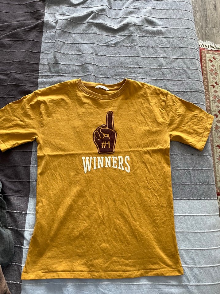 MNG KIDS marka Erkek çocuklar için sarı pamuklu kumaştan, bisiklet yaka kısa kollu, "WINNERS" baskılı tişört. ✨ 13/14 yaş