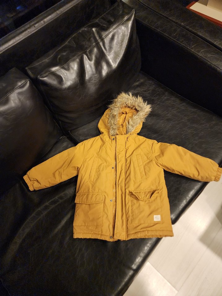 cok iyi durumda Sarı kapüşonlu, kürk detaylı, yumuşak ve sıcak tutan fleece kumaştan yapılmış erkek çocuk montu. Rahat kesim, sokak stili için uygun.
