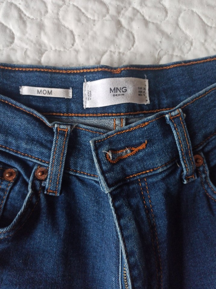 MNG markalı, düğmeli, baskılı detaylı, normal boy mavi mom jean, trendi ve rahat günlük kullanım için uygun.