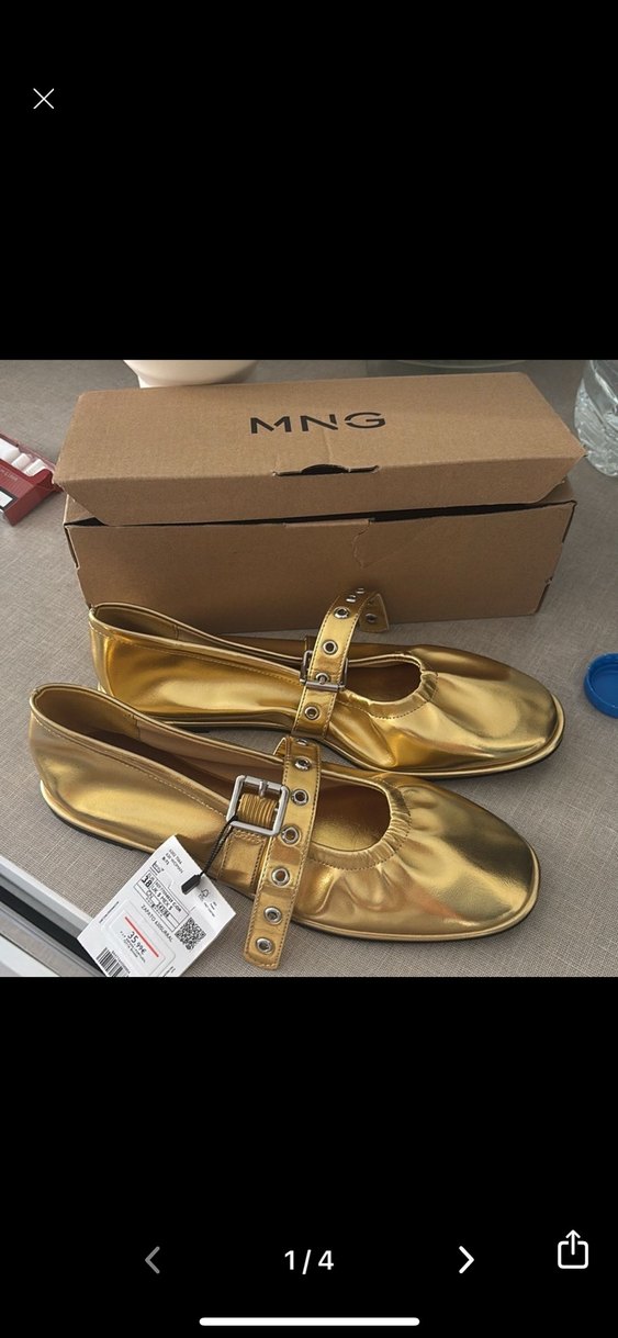 MNG markalı, parlak altın renkli, tokalı ve blok topuklu kadın babet. Sokak modasına uygun, rahat kauçuk malzemeden üretilmiştir. Desensiz tasarım.