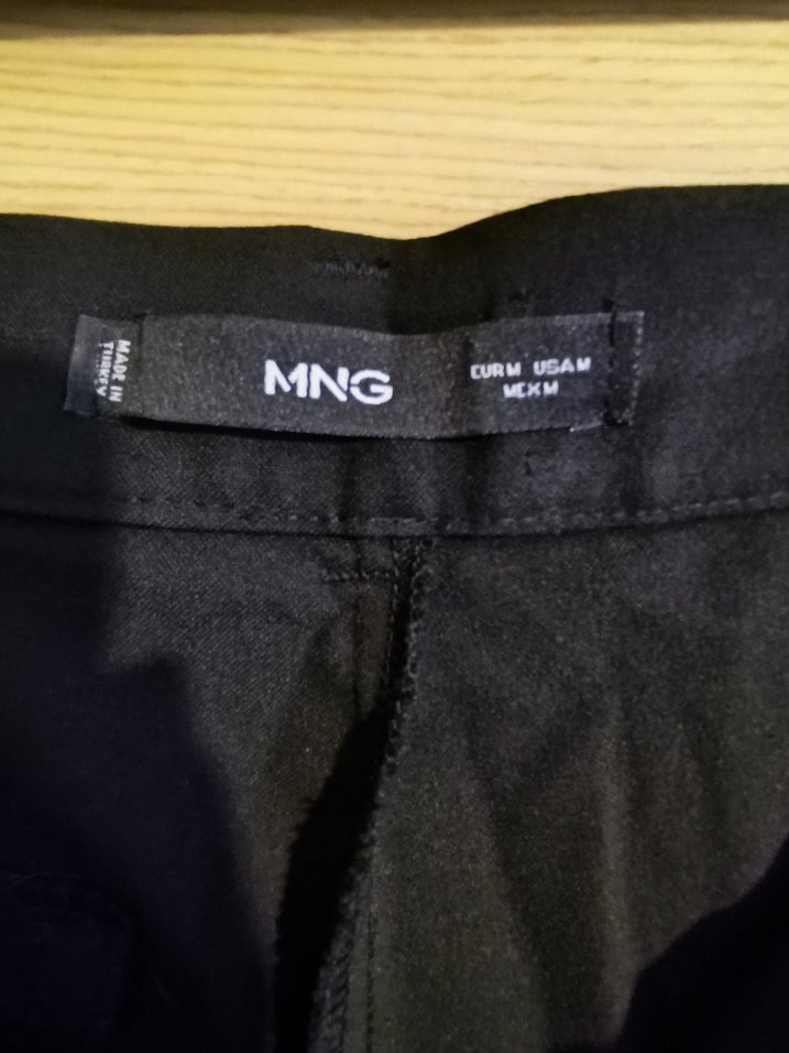 MNG marka, düğmeli detaylı, baskılı desene sahip siyah, kumaş, dar kesim kadın pantolon. Ofis için uygun, normcore tarzda. sıfır ürün m ve l bedeni mevcut orjinal