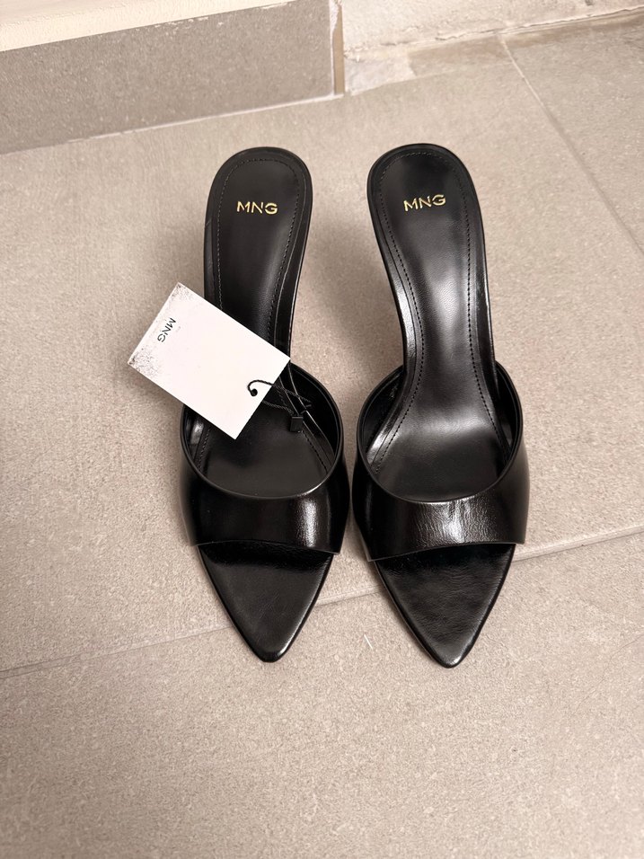 MNG markalı siyah stiletto topuklu terlik, baskılı deseni ve çağdaş tasarımıyla romantik akşamlar için şık ve iddialı bir seçim.