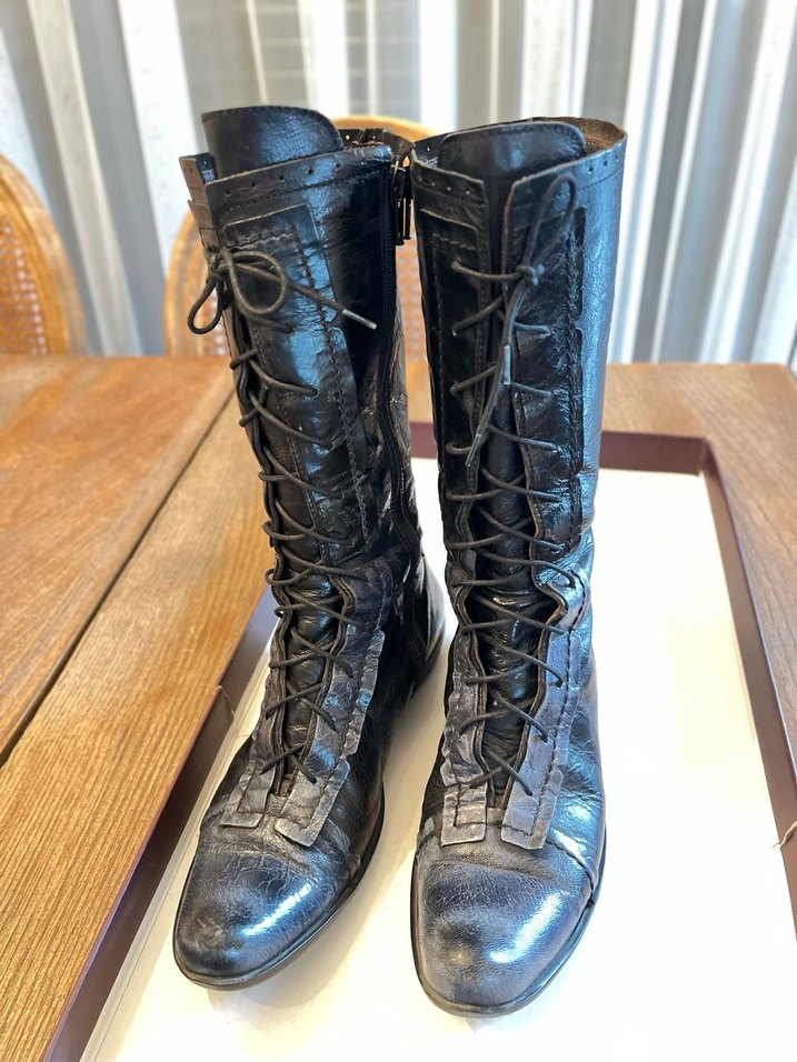 Siyah deri, bağcıklı ve fermuarlı gotik tarzda kadın çizmesi, günlük kullanıma uygun. Çok tarz İtalyadan alınmıştı. Temiz kullanıldı.