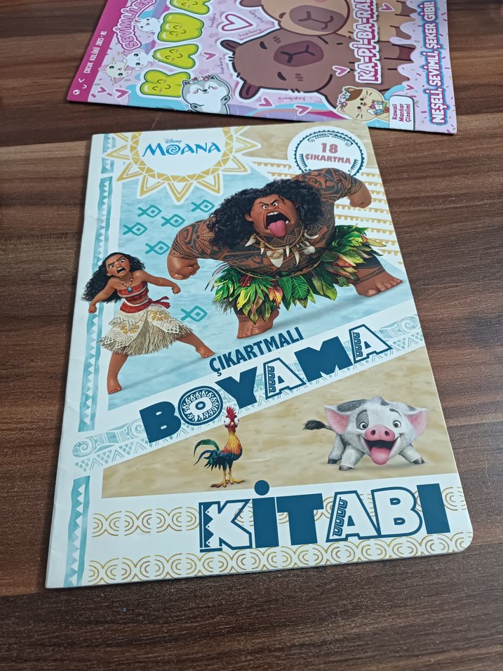 Moana çıkartmalı boyama kitabı Bu çocuk kitabı, Moana ve Maui ile Pasifik Okyanusu'nda büyük bir maceraya davet ediyor. En sevdiğin boya kalemlerini kap ve Pasifik Okyanusu’nda muhteşem bir maceraya dalış yap! Yarı tanrı Maui’yi bulma görevinde Moana’ya yardım et ve çalınan Te Fiti’yi ait olduğu yere geri götür! Hayatının en büyük macerası seni bekliyor! ilk 2-3 sayfada hafif boyama var stickerlardan da 2 tanesi eksik onun dışında çok temiz bir kitap
