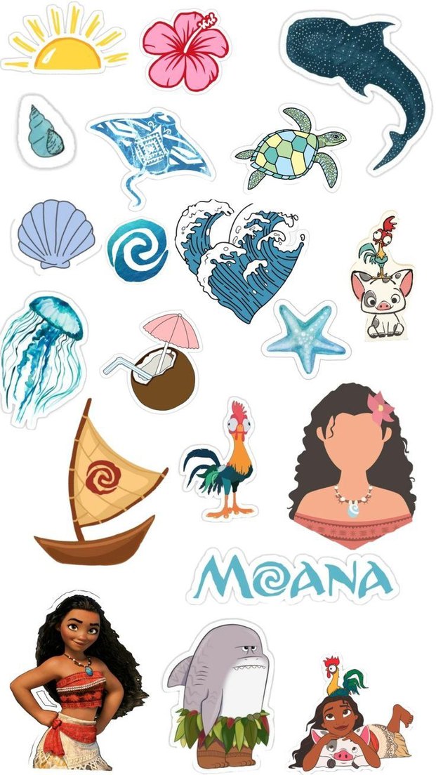 Moana temalı, mavi tonlarında çocuklar için deniz ve havuz ürünleri çıkartmaları, üzerinde 'MOANA' yazısı bulunur.