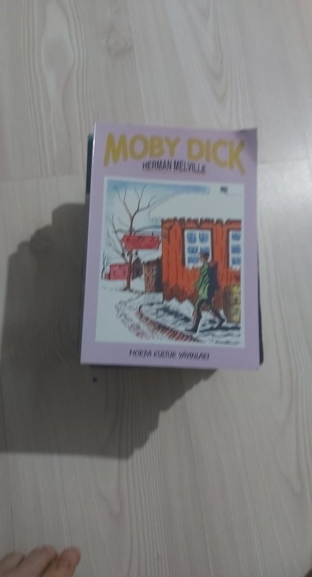 Herman Melville'in "Moby Dick" adlı hikaye kitabı, karla kaplı bir ortamda bir kişinin bina yanında yürüdüğünü gösteren illüstrasyonlu kapak içerir.