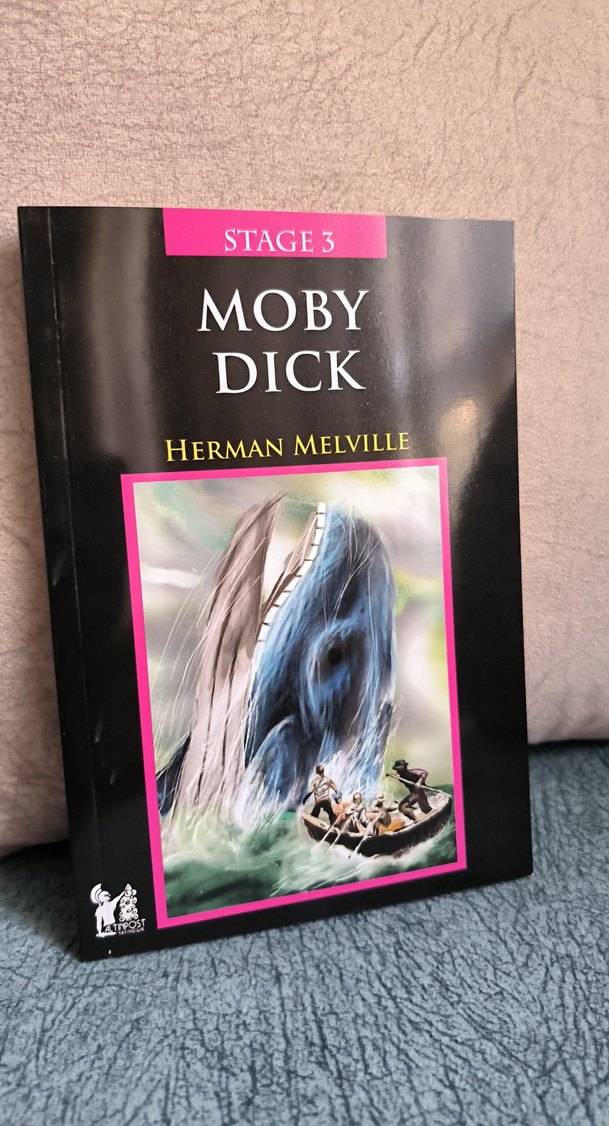 Herman Melville'in Moby Dick kitabı, balina ve sandal içindeki denizcileri gösteren etkileyici kapakla Stage 3 serisine ait.
