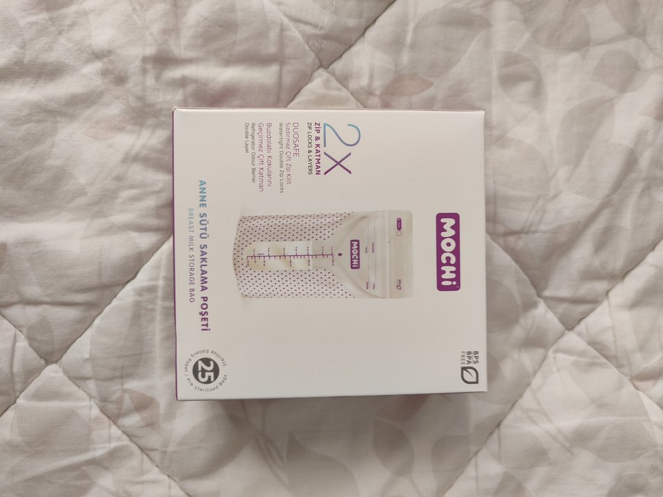 MOCHI markalı, çift kilitli ve ölçü işaretli anne sütü saklama poşetleri. 25'li paket halinde, güvenli ve hijyenik saklama sağlar.