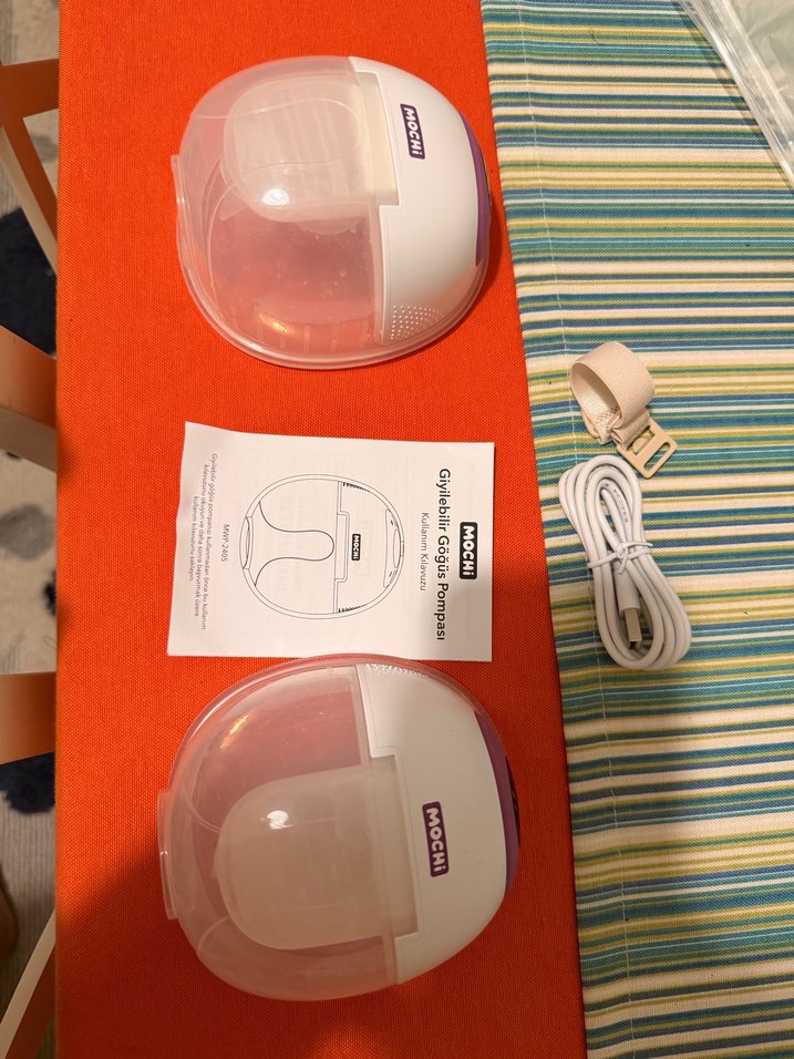 Beyaz renkli Mochi elektrikli göğüs pompası seti, iki pompa ünitesi, USB şarj kablosu ve klips içerir. Kolay ve etkili süt sağımı sağlar.