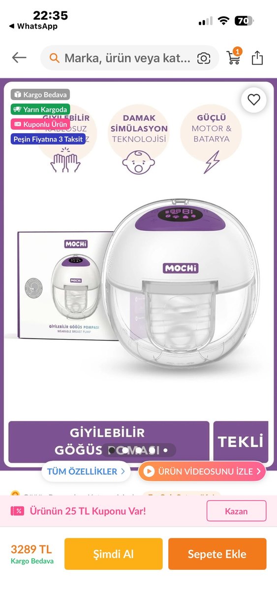 Mochi markasına ait mor renkli giyilebilir göğüs pompası, güçlü motor ve batarya ile damak simülasyon teknolojisi sunar. Tekli kullanıma uygundur. Sıfır üründür faturası mevcut