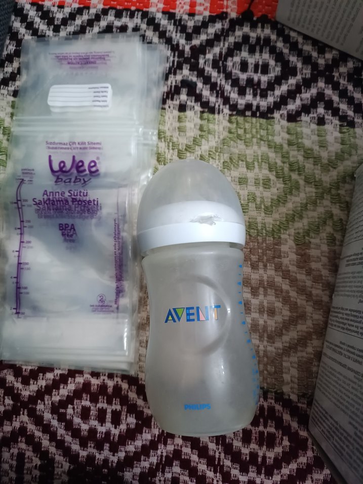 Beyaz Avent bebek biberonu, pastel renkli Lelee anne sütü saklama poşetleri ile birlikte. hepsi bir bu fiyata