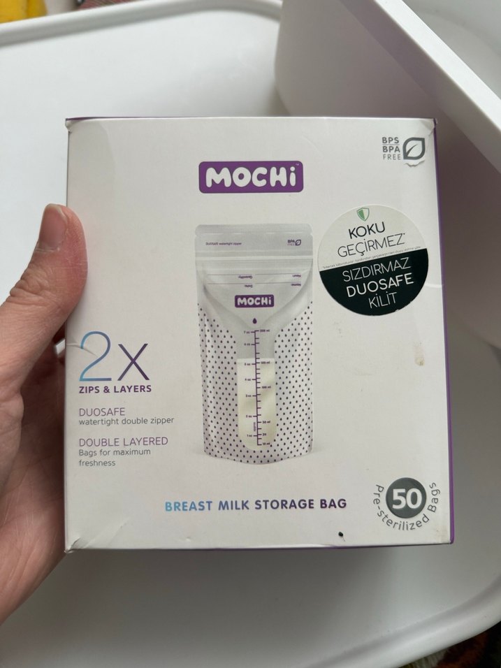 Mochi anne sütü saklama poşetleri, çift katmanlı ve çift kilitli yapısıyla sızdırmazlık ve tazelik sağlar. 29 adet steril poşet kaldı.