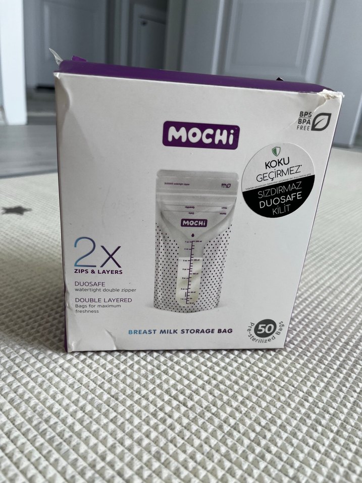 Beyaz ve gri renklerde Mochi göğüs sütü saklama poşetleri, çift katmanlı, sızdırmaz ve koku geçirmez özellikte. Pakette 40 adet poşet bulunur.