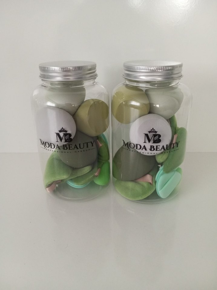 Moda Beauty logosu ve işareti bulunan şeffaf kavanozlarda saklanan pastel tonlarda haki makyaj süngerleri seti. 2 KAVONOZ FİYATIDIR