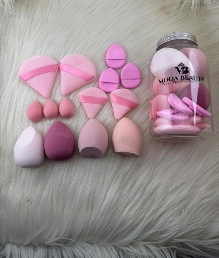 Moda Beauty markalı pastel pembe tonlarında farklı şekil ve boyutlarda makyaj süngerleri içeren set. Pürüzsüz makyaj için uygundur.