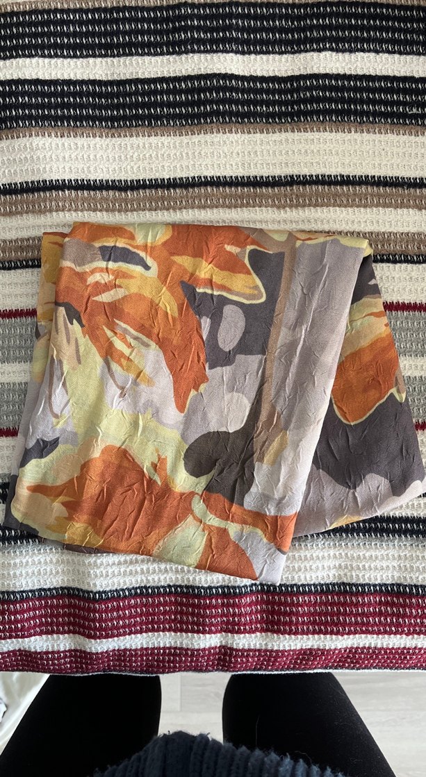 Bohem tarzda, çok renkli ve sıcak toprak tonlarında dokuma kadın şal. Hippie ve retro stillerle uyumludur.