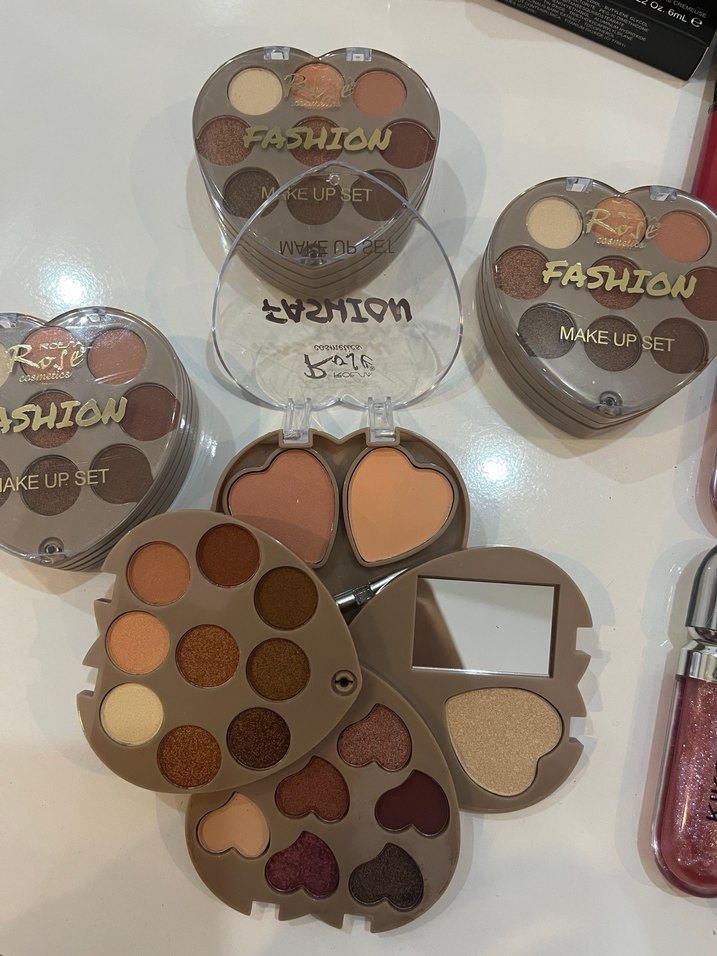 Mat ve ışıltılı kahverengi tonlarında farlar içeren kalp şeklinde bir palet. İçinde ayna bulunur. "FASHION MAKEUP SET" yazılıdır. Sıfır üründür Adet fiyatıdır