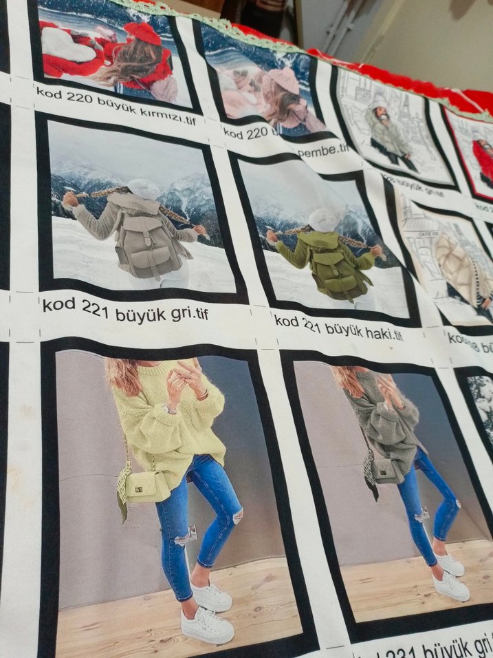 Farklı renk ve modellerde sırt çantaları ile günlük kıyafetlerin detaylı görsellerle yer aldığı moda katalogu kumaş uygundur