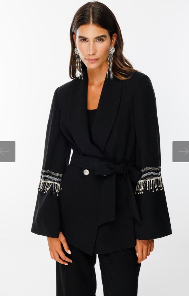 Modailgi markasına ait Siyah renkli, taş detaylı ve kuşaklı uzun kollu kadın blazer. klasik şıklık ve iş ortamı için uygun. #madoilgi #kadınceket