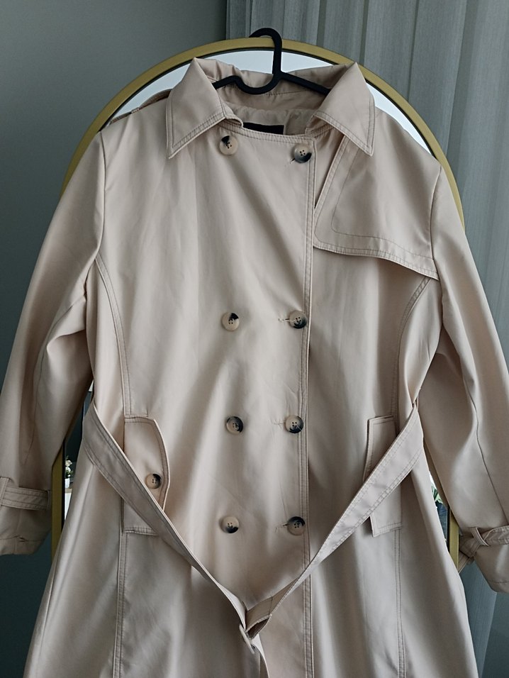 Bej midi uzunlukta, düğmeli ön ve kesimli yakalı kadın trençkot. Düz sentetik kumaştan, askılı kollu ve klasik sokak stili için regular fit.