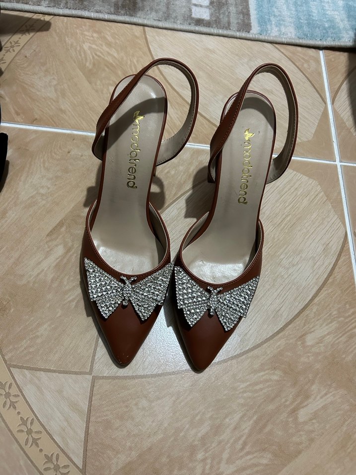 Modatrend kahverengi deri, kemerli yüksek topuklu ayakkabılar parlak yüzeye ve klasik, desen içermeyen tasarıma sahiptir. Düğünler için uygundur.
