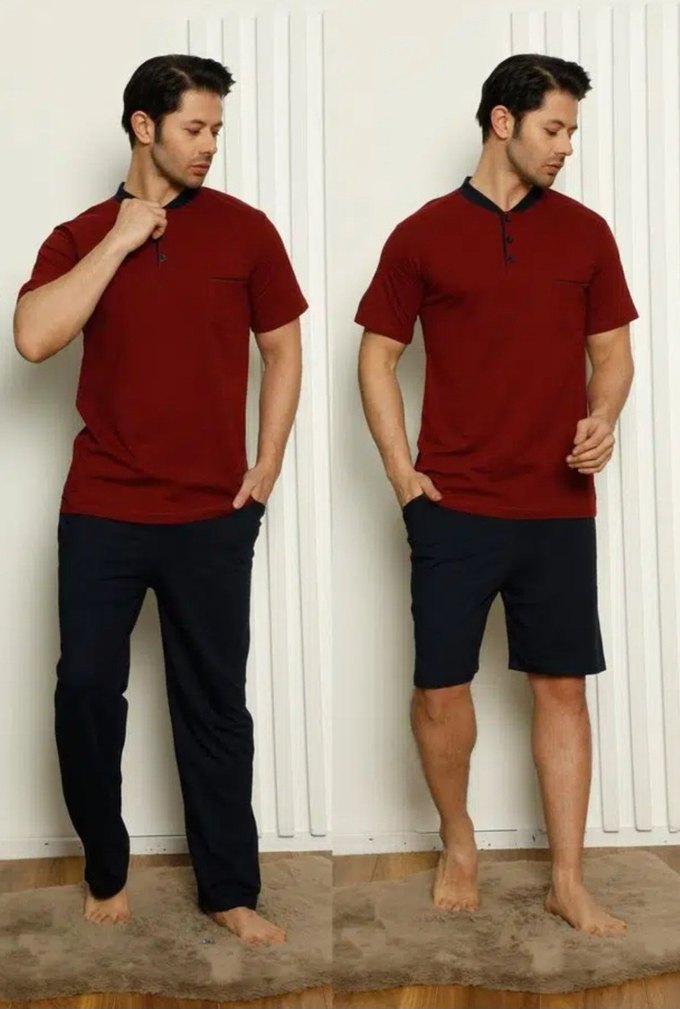 Erkek pijama takımı, bordo kısa kollu ve yuvarlak yakalıdır. Üst, bol kesim olup uzun veya kısa koyu altlarla rahat ve şık bir görünüm sunar. Beden: M-L-XL