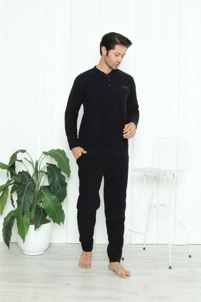 Erkekler için siyah, uzun kollu, bisiklet yaka ve regular fit polar pijama takımı. Midi boy ve desen içermeyen sade tasarımıyla rahat ve şık bir görünüm sunar. Beden: M-L-XL-XXL