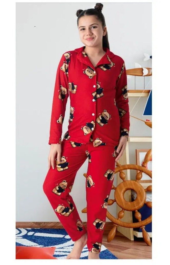 Uzun kollu, uzun boy renkli ayıcık baskılı kırmızı kız çocuk pijama takımı, rahat kesim ve sokak modası tarzında, konforlu kumaşla. Yaş: 7-8-9