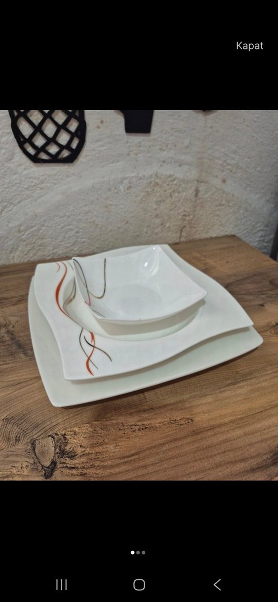 Modern beyaz, desensiz yemek takımı. Bir parçada ince kıvrımlı çizgiler bulunur. Kare tabak ve kase içerir. ️ 7 adet çorba kasesi ve 6 adet yemek tabağı ve 5 adet servis tabağı vardır. Ürün çok temiz kullanıldı.