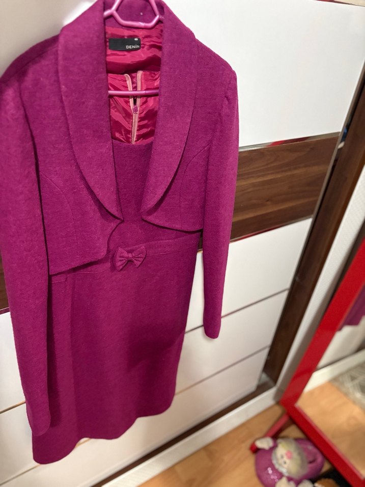 renkli, parlak sentetik kumaştan üretilmiş, düğmeli ve geniş yaka detaylı ceket ve elbise ayrı olarak kullanılabilir Ofis için modern klasik tarzda, regular fit ve uzun kolludur. Özel günlerde giyilebilecek üründür