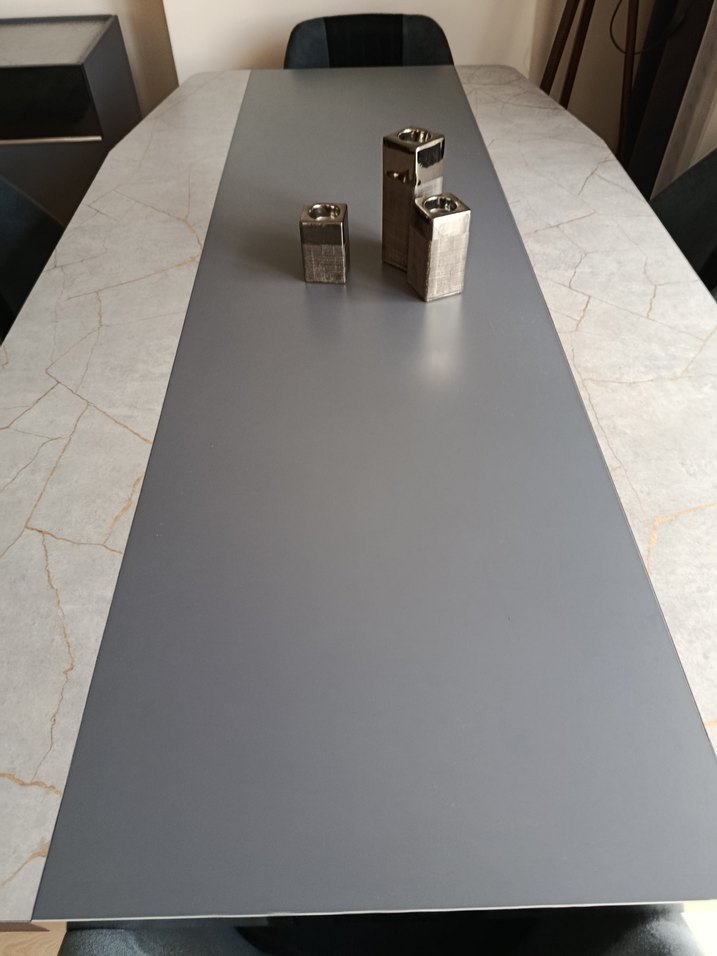 Canlı gri tonlarda baskılı desene sahip 6 kisilik sabit modern yemek masasi. Hem şık hem kullanışlıdır.Ayak olarak kullanilan kisimda gizli dolaptir.sandalye ayaklari ahsap renge cevrildi. İstanbul elden teslimat.