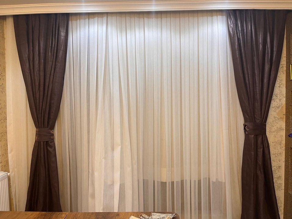 Açık bej renkli, modern tarzda düz tül perde, yumuşak ve şık bir görünüm sunar. En 90 boyu 2,60 cm