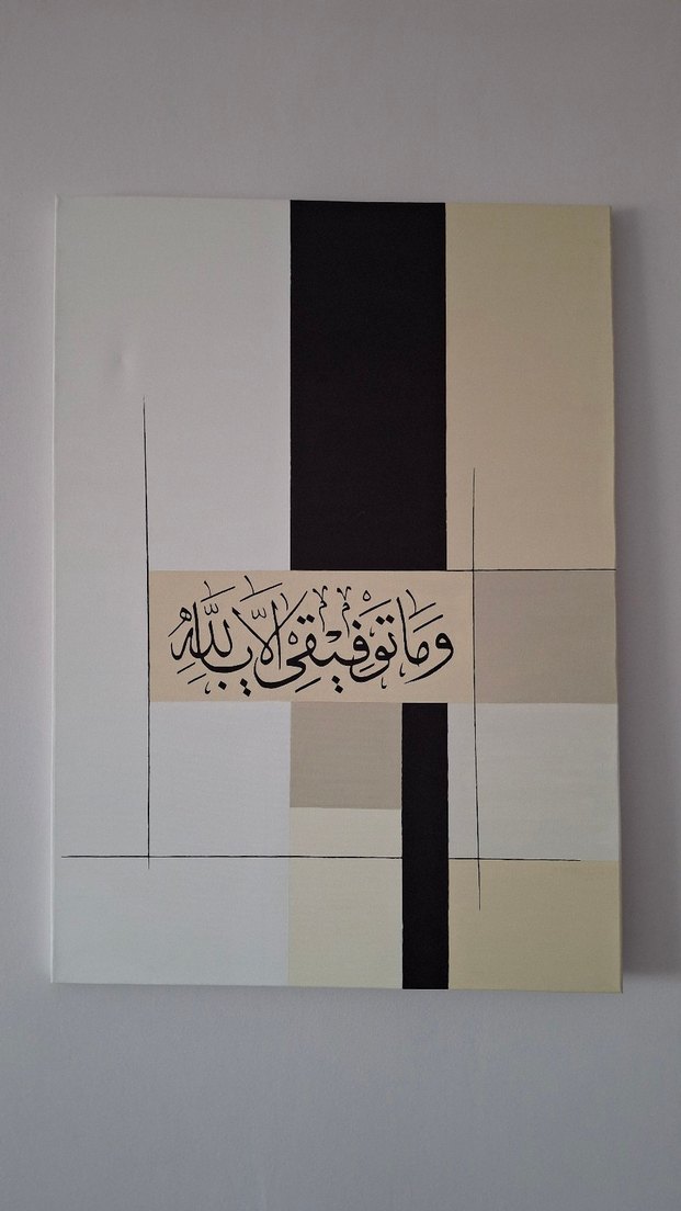 Bu tablo, koyu ve beyaz geometrik şekillerle modern hat sanatı sunar, dengeli ve şık bir tasarım oluşturur. ️ El emeği 50×70 boyutunda sipariş alınır. #elemeği #arapçahat #hat #tablo