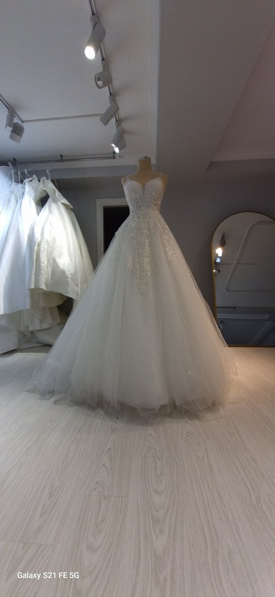 Straplez,kedi kulağı beyaz uzun helen gelinlik, dantel detaylı gövdesiyle modern klasik ve göz alıcı bir görünüm sunar. Kolsuz ve regular fit tasarımdadır.