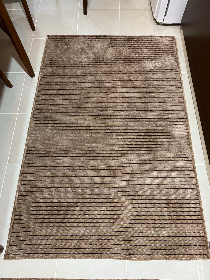 Bu modern halı, kahverengi zemin üzerinde gri ince yatay çizgilerle sade ve çağdaş bir görünüm sunar. Yumuşak dokusuyla çeşitli mekanlara uygundur. 150x100 ölçüsündedir