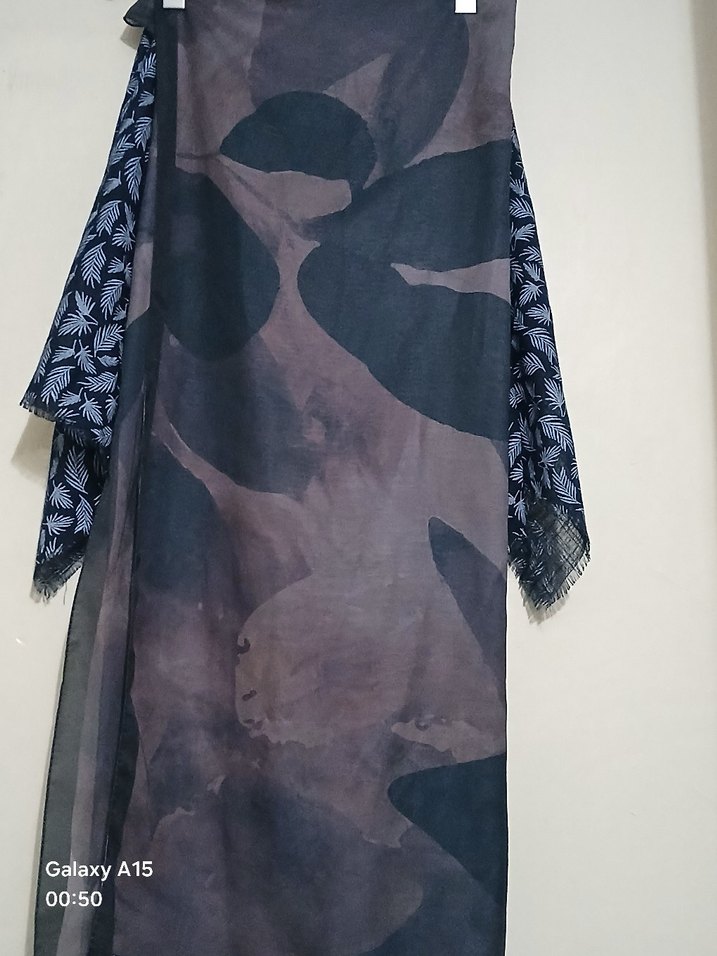 Koyu kahverengi, dökümlü tasarıma sahip kadın şalı, yumuşak sentetik kumaştan üretilmiştir, avangart stil için uygundur.