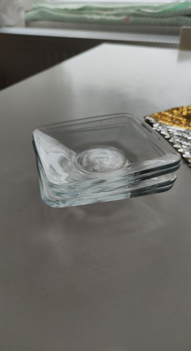 Modern tasarıma sahip, parlak ve altın renkli kare cam tabaklar.cay bardagi tabağı 4 adettir