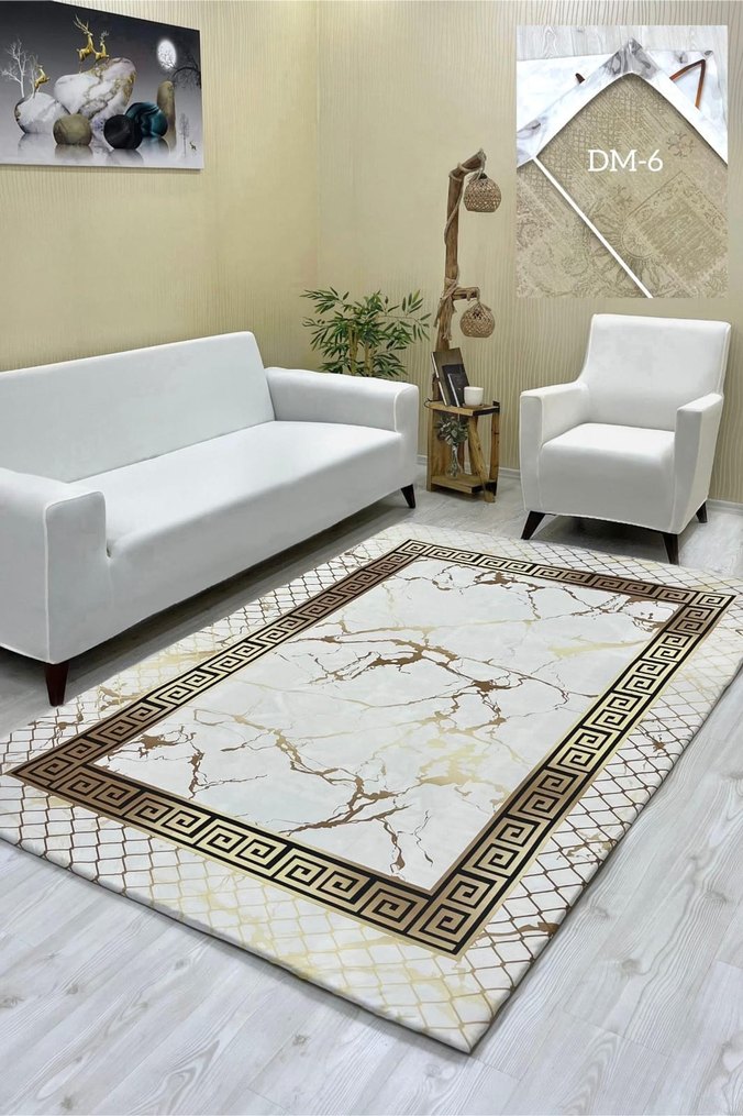 Modern klasik tarzda, beyaz gold mermer desenli ve dekoratif bordürlü halı örtüsü 6m² (200*300) ölçüde altta ekstra kayma önleyici 2 adet lastik eklentisi bulunur ve 4 kenar lastiklidir.