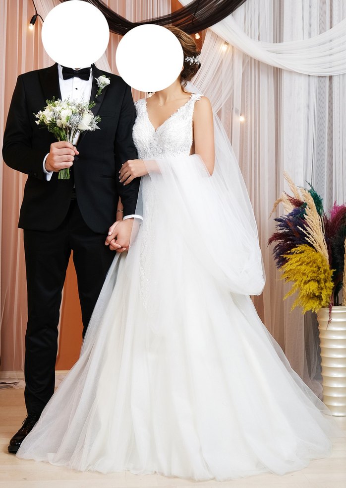 Uzun beyaz A kesim gelinlik, kolsuz ve kesik yaka detaylıdır. Minimalist, modern klasik tarzda, klasik şıklık için uygundur.