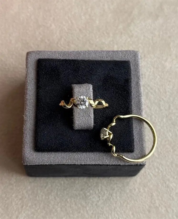 Düğünler için modern klasik tarzda, tokalı ve desenli altın kadın yüzük. Paris esintili gri kutuda sunulur.