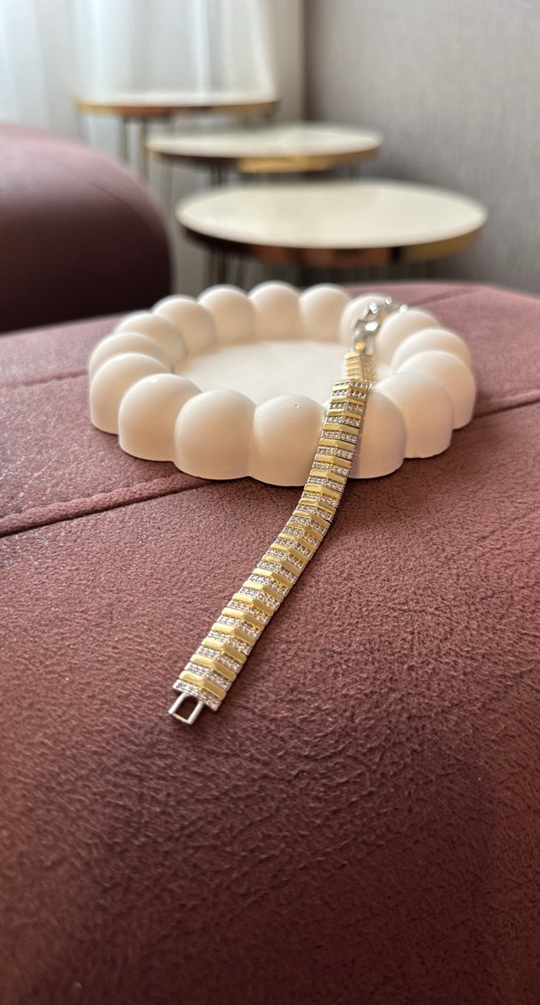 Bu kadın bilekliği, parlak altın tonları ve yılan derisi desenine sahip boncuklu tasarımıyla modern klasik ve göz alıcı bir şıklık sunar. Günlük kullanım için uygun. ✨