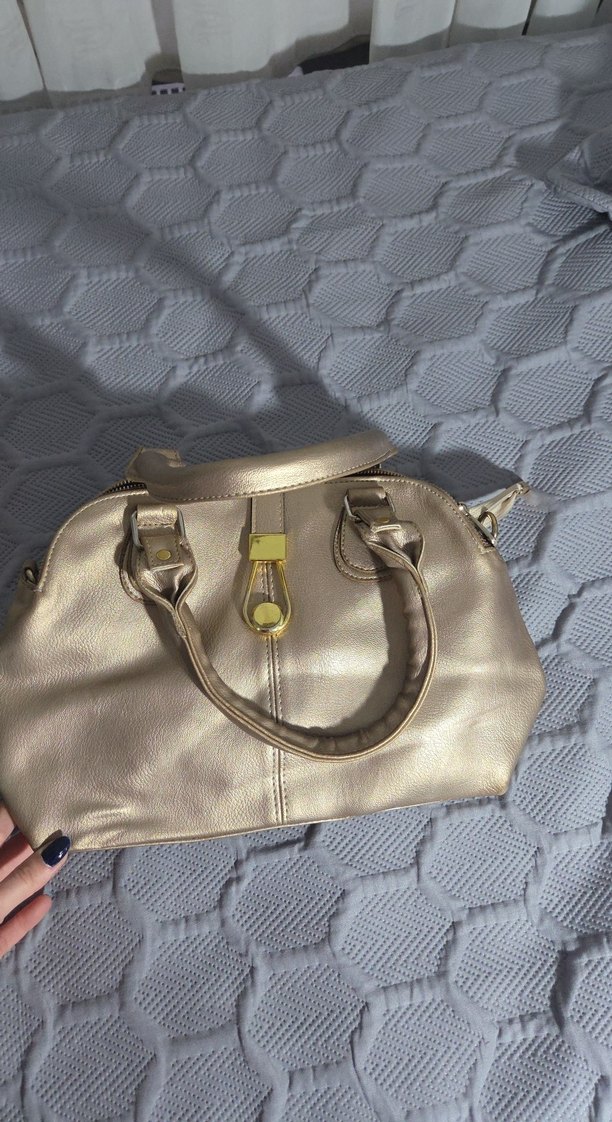 Modern klasik tarzda, altın renkli deri kadın çantası. Tokalı kulpları ve desen içermeyen şık tasarımıyla günlük kullanıma uygundur.